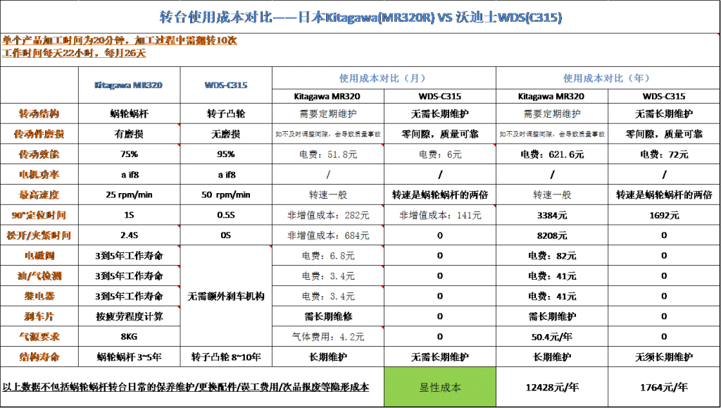 汽車配件行業(yè)一位客戶在試用沃迪士WDS-C315型號時將沃迪士第四軸產(chǎn)品與其原有的日本北川Kitagawa MR320R型號性能進行了跟蹤和記錄,測試詳細結(jié)果如下表。沃迪士數(shù)控回轉(zhuǎn)臺以其獨特的滾子凸輪結(jié)構在轉(zhuǎn)速、傳動效率和維護成本上展現(xiàn)了明顯的優(yōu)勢。
