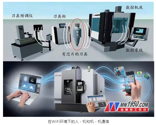 從圖中可見,不僅人機的交互方式從控制面板延伸到移動終端,設(shè)備和工具之間也可以進(jìn)行物與物的通信。機床的加工精度和效率在很大程度上取決于刀具的狀態(tài),如果在刀具或刀柄上嵌入芯片,就成為智能刀具。芯片不僅可以記錄在刀具預(yù)調(diào)儀上進(jìn)行調(diào)整時的數(shù)據(jù),還可以記錄刀具在機床進(jìn)行了多長的切削時間,還有多少剩余壽命,可以加工幾個零件等都可以讓操作者和有關(guān)部門了如指掌,減少停機和更換刀具的時間。智能刀具及其管理的概念如上圖所示。