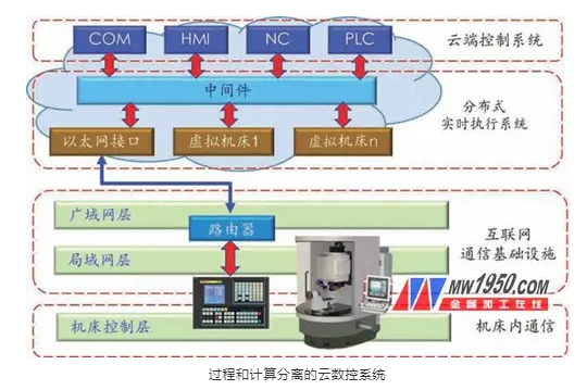 智能工廠的數(shù)控機床和機器人等智能裝備的未來發(fā)展重點已經(jīng)不在硬件,感知外部環(huán)境和工況變化需要更加強大的計算能力、通信帶寬和速度,才能進(jìn)行實時控制,形成真正的信息物理融合系統(tǒng)。它的特點是將設(shè)備的控制分為計算和過程兩部分,把運動控制保留在本地,而將計算移到云端,在云端“克隆”相應(yīng)的虛擬設(shè)備,在云端進(jìn)行虛擬制造,如圖所示。