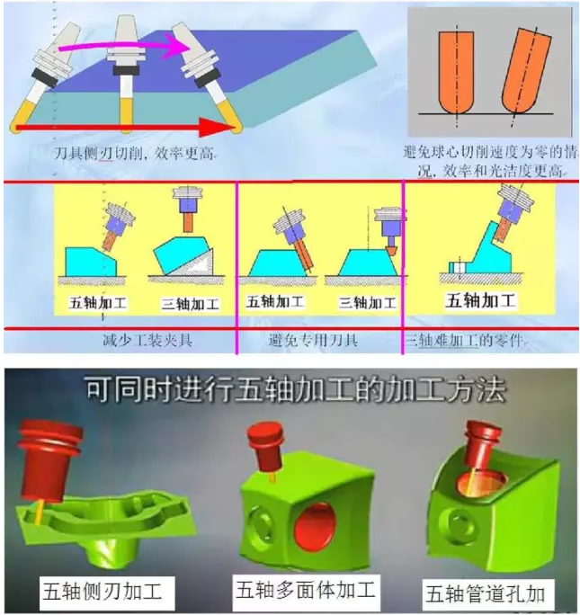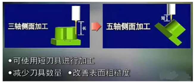 與三軸聯(lián)動的數(shù)控加工相比,從工藝和編程的角度來看,對復(fù)雜曲面采用五軸數(shù)控加工有以下優(yōu)點: