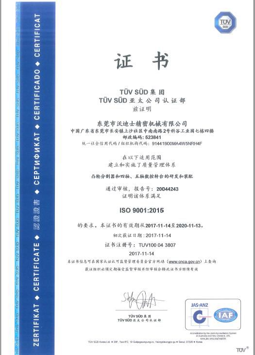 近日沃迪士在"凸輪分割器和四軸、五軸的研發(fā)和裝配”的質(zhì)量管理上的有效性通過(guò)了國(guó)際權(quán)威認(rèn)證機(jī)構(gòu)南德TUV SUD第二階段的嚴(yán)格審廠,獲得了ISO9001:2015 證書(shū)。