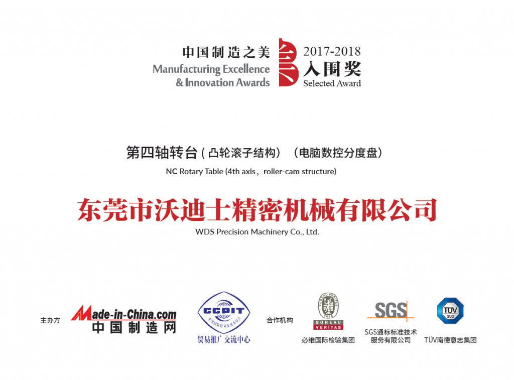 沃迪士參賽產(chǎn)品(第四軸轉(zhuǎn)臺 (凸輪滾子結(jié)構(gòu))(電腦數(shù)控分度盤))經(jīng)過初評、終評兩輪評選,從中國制造之美2017屆13個參賽組別4309件參賽產(chǎn)品中脫穎而出,榮獲2017“中國制造之美”年度評選 工業(yè)設(shè)備及組件 類 入圍獎!并將獲得由活動主辦方中國制造網(wǎng)、貿(mào)促會貿(mào)推中心,聯(lián)合國際三大知名認(rèn)證機構(gòu)SGS、BV、 TüV南德頒發(fā)的榮譽獎牌。