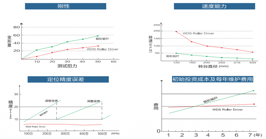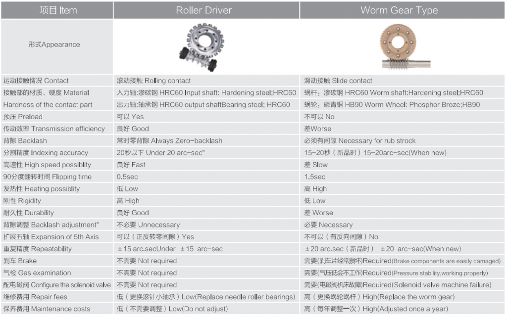 目前市場上的轉臺產品以蝸輪蝸桿結構為主。渦輪材料為磷青銅,無法加預壓,剛性差,隨著使用磨損整個轉臺精度不斷下降,導致極高的后期維修成本,給機床用戶及代理商都帶來很多困擾和經濟損失。要規(guī)避蝸輪蝸桿結構的缺點,蝸輪蝸桿的材料需要特殊處理(如日研、雷曼等高端品牌),但價格昂貴,一般客戶無力承擔。